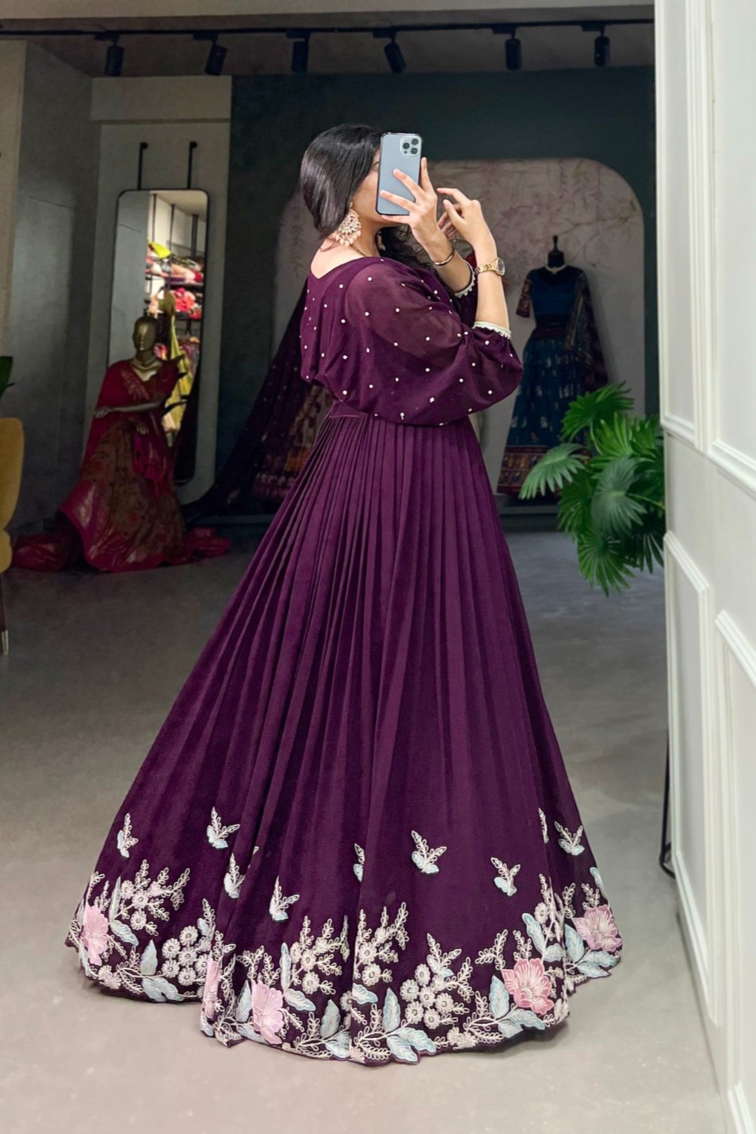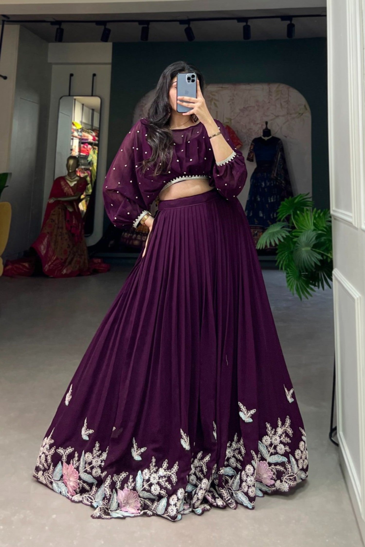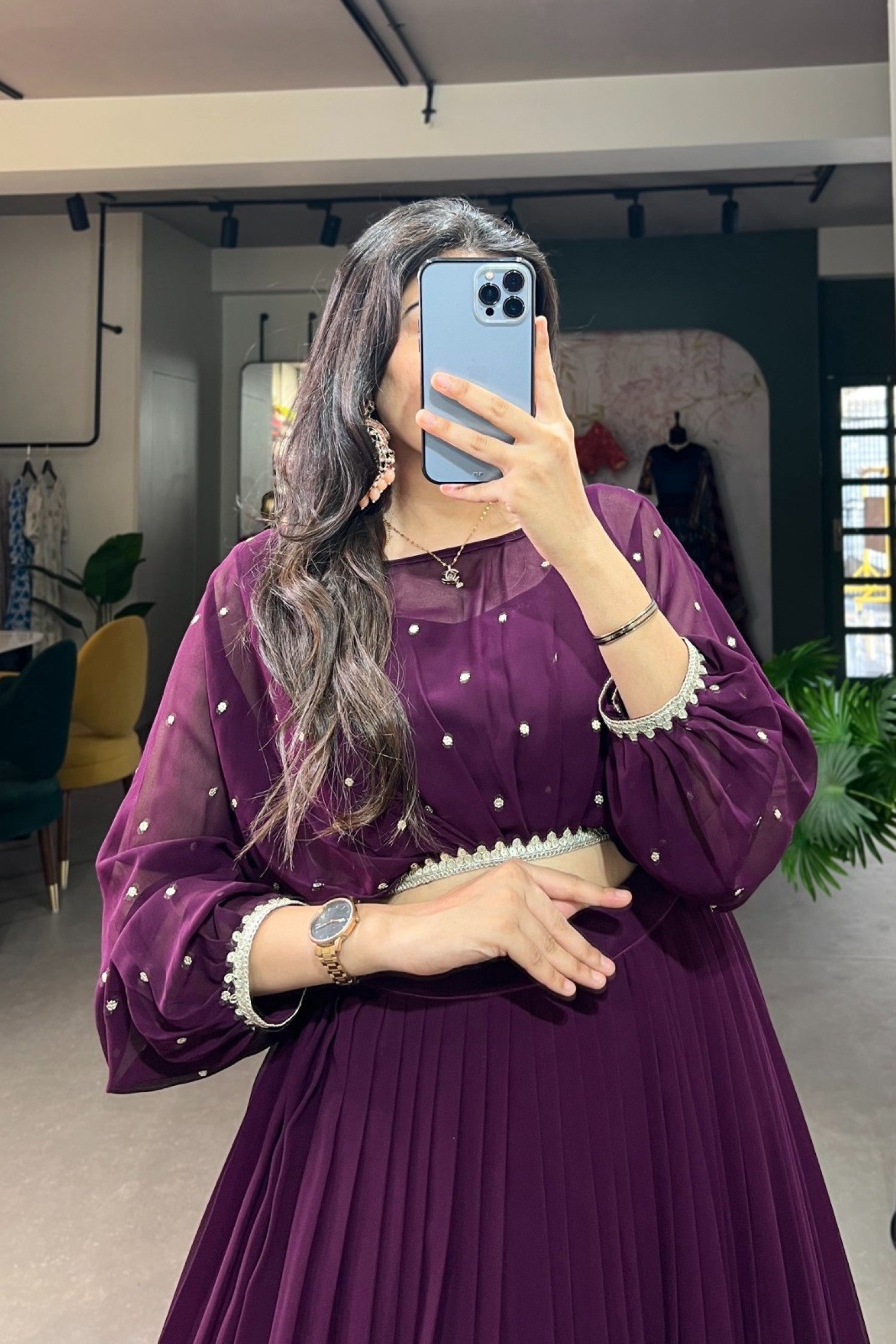 Royal Plum Pearl-Studded Crop Top Pleated Lehenga